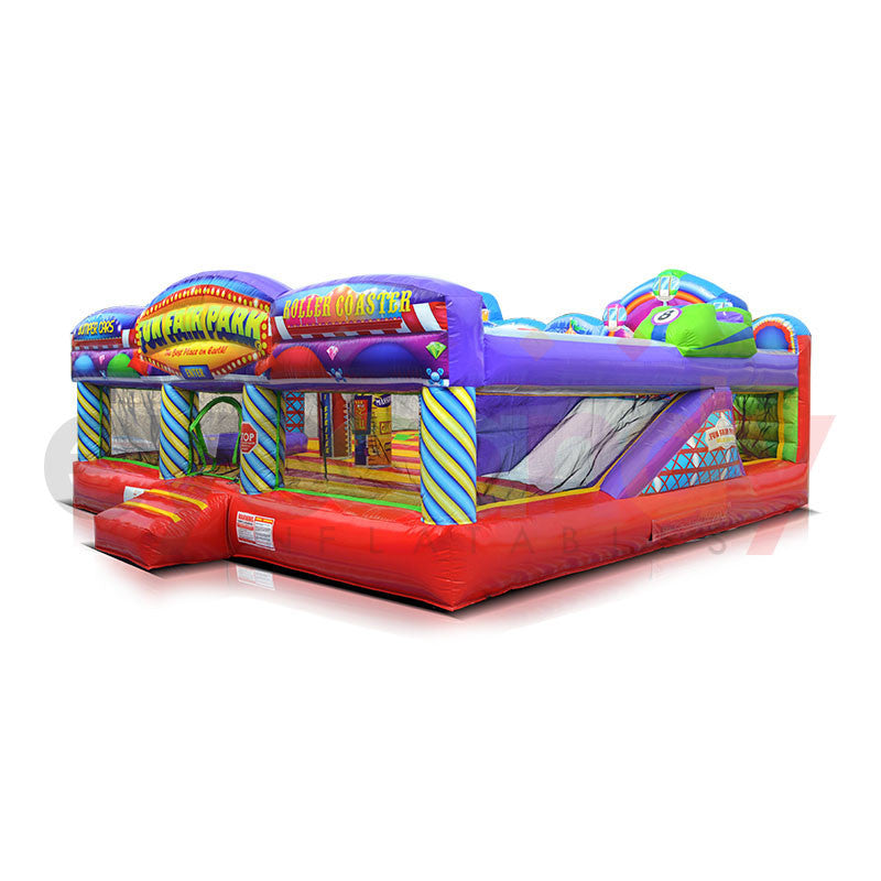 Product Description: There is no better way to prepare a child for roller coasters, bumper cars, funhouses and ferris wheels than setting them loose in the all new Fun Fair Park Jr. Like any amusement park, children won’t want to leave once they bounce, climb and slide their way through this bright, safe and colorful amusement park themed play center.